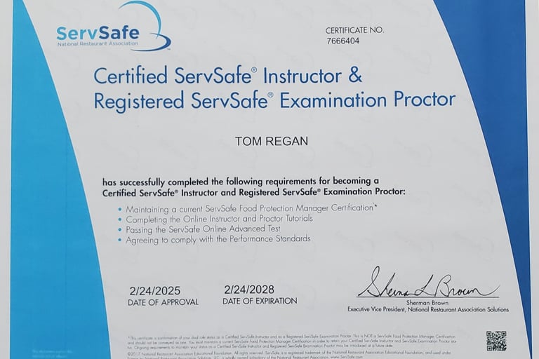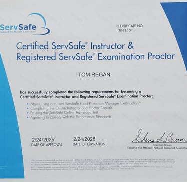 I also teach food safety; I am a certified instructor/proctor with the National Restaurant Association's ServSafe program. The Certified Food Protection Manager seminar is a 3-hour immersion review of the material in the supplied textbook, followed by a two-hour certification test. I am also available for food handler courses, which would be a more relaxed 2-hour session discussing how to keep food safe, with no test involved. I will issue a certificate of attendance.