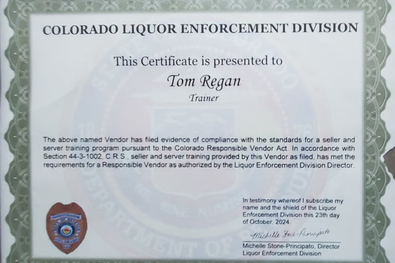 I renew my certification with the Colorado Liquor Enforcement Division every two years. My class material is reviewed for accuracy regarding current laws and rules. I have seen a lot of changes in the liquor industry over the years, so I try to stay up to date with liquor rule changes and maintain a respectful relationship with the Colorado Liquor Enforcement Division.